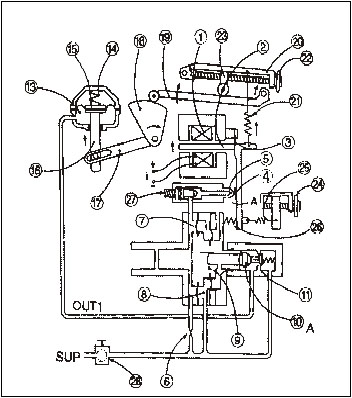 單動作型定位器可以使用(A-M)裝置,向右旋到底可遮斷噴嘴,氣源壓力就接通氣管OUT,即通過手動調(diào)節(jié)空氣調(diào)壓器,可調(diào)節(jié)定位器的輸出壓力(參照動作原理4)但(A-M)裝置不能用于單動作型反作用控制。