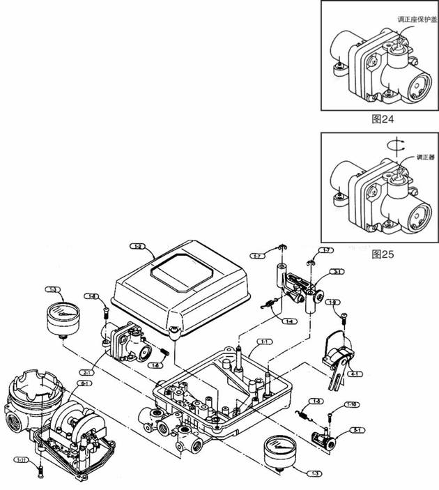 · 需調(diào)整閥座調(diào)整器時將護(hù)蓋螺釘松開,取下護(hù)蓋(圖24)。